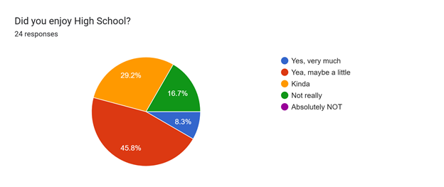 To start, when there were only 12 responses, I noticed they all favored college. I’m glad I kept collecting responses after, because the 12 responses that came after definitely tipped the scale more than I anticipated. There are 3/24 participants who dropped out of college, while the other 21 participants are either still in college or have graduated already. Most of the people who have graduated already, have graduated recently with some outliers ranging from 1989 to 2017. The following chart shows how many people enjoyed high school:
