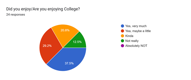 One participant who voted “Kinda” voiced that their first two years they “did not have many friends and not many fun experiences”, whereas their last two years they “were lots of fun after I started to open up more, did theatre, band, clubs. COVID messed with my senior year but still enjoyed my studies and peers.” I noticed a theme emerged from a lot of people’s responses. People enjoyed extracurriculars, having a routine, and being around friends, if they had any, but there are not a lot of mentions of being able to thrive in the way that the environment is advertised. School is there to help us be able to learn and grow, but the responses I got highlight fulfilling social needs more than anything. For comparison, here is the chart showing how many people enjoyed/are enjoying college: