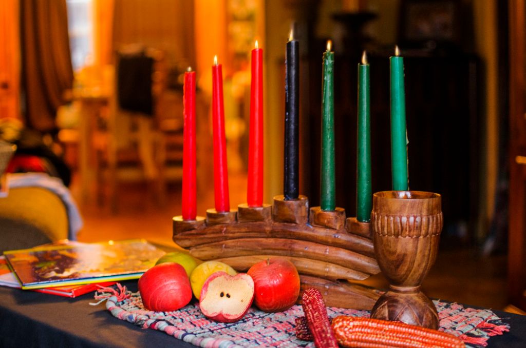 Each day of Kwanzaa is tied to the holiday’s seven principles: unity (umoja), self-determination (kujichagulia), collective work and responsibility (ujima), cooperatve economics (ujamaa), purpose (nia), creativity (kuumba), and faith (imani). A new candle is lit on the kinara (candleholder), culminating with a feast on the final day.
